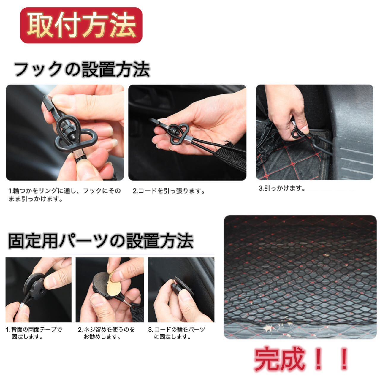 ・セット内容:カーゴネット×1、フック×4、取り付けねじ×4、固定用バーツ(両面テープ)×4