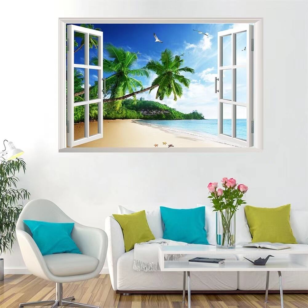 ウォールステッカー BFC006 3D窓 海 砂浜 ヤシ 癒す DIY 壁紙 インテリアシート 剥がせるシール 送料無料