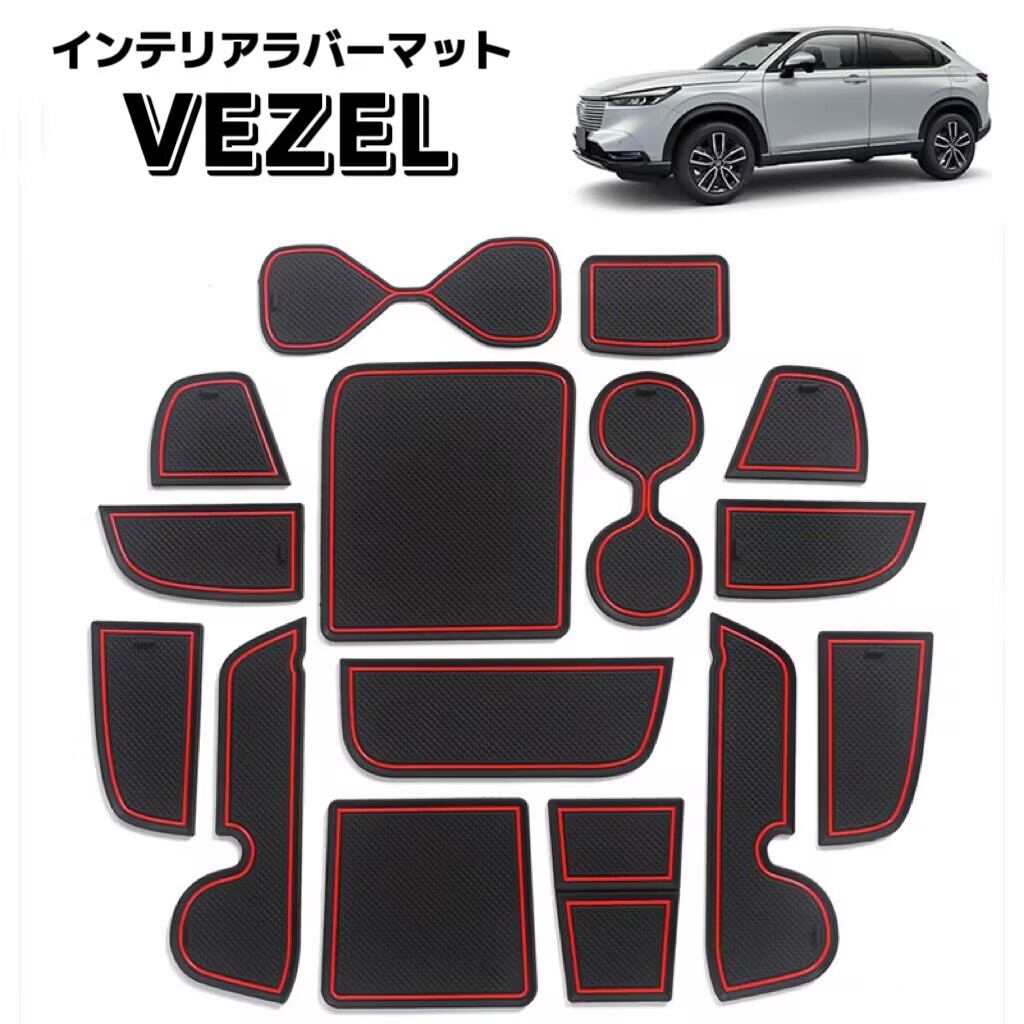VEZEL ヴェゼル用 対応 インテリアラバーマット ドアポケットマット ノンスリップマット フロアマット コンソールマット ゴムマット 内装パーツ 耐久性 防水 汚れ防止 騒音防止 車の滑り止め アクセサリー 保護カバー 15ピース ブラック×レッド car-17